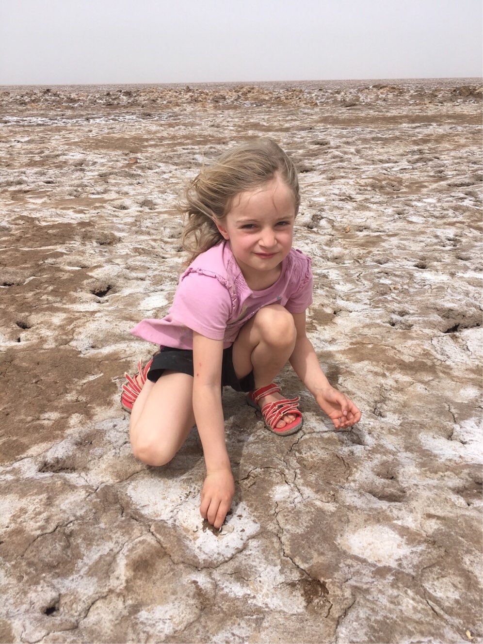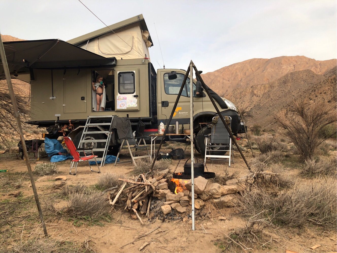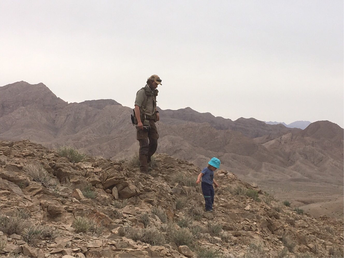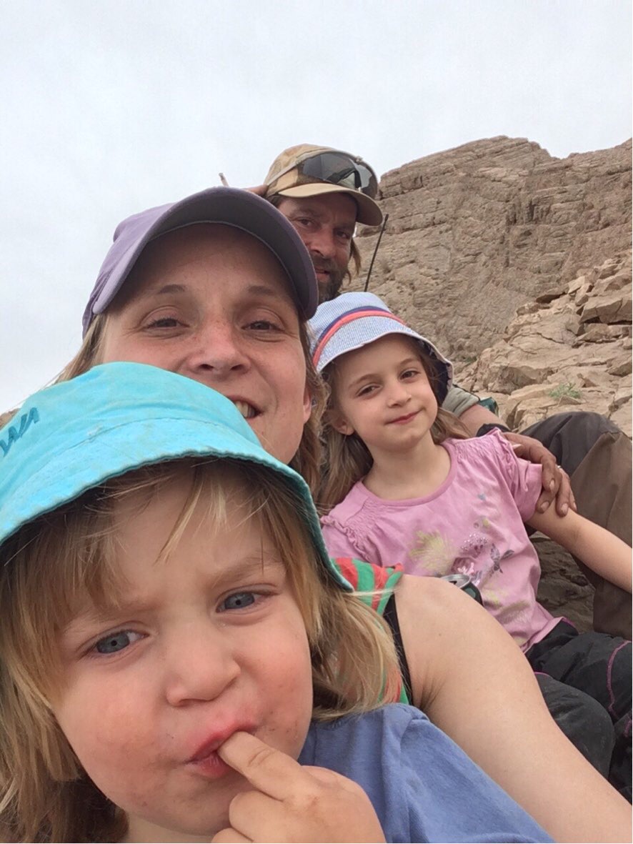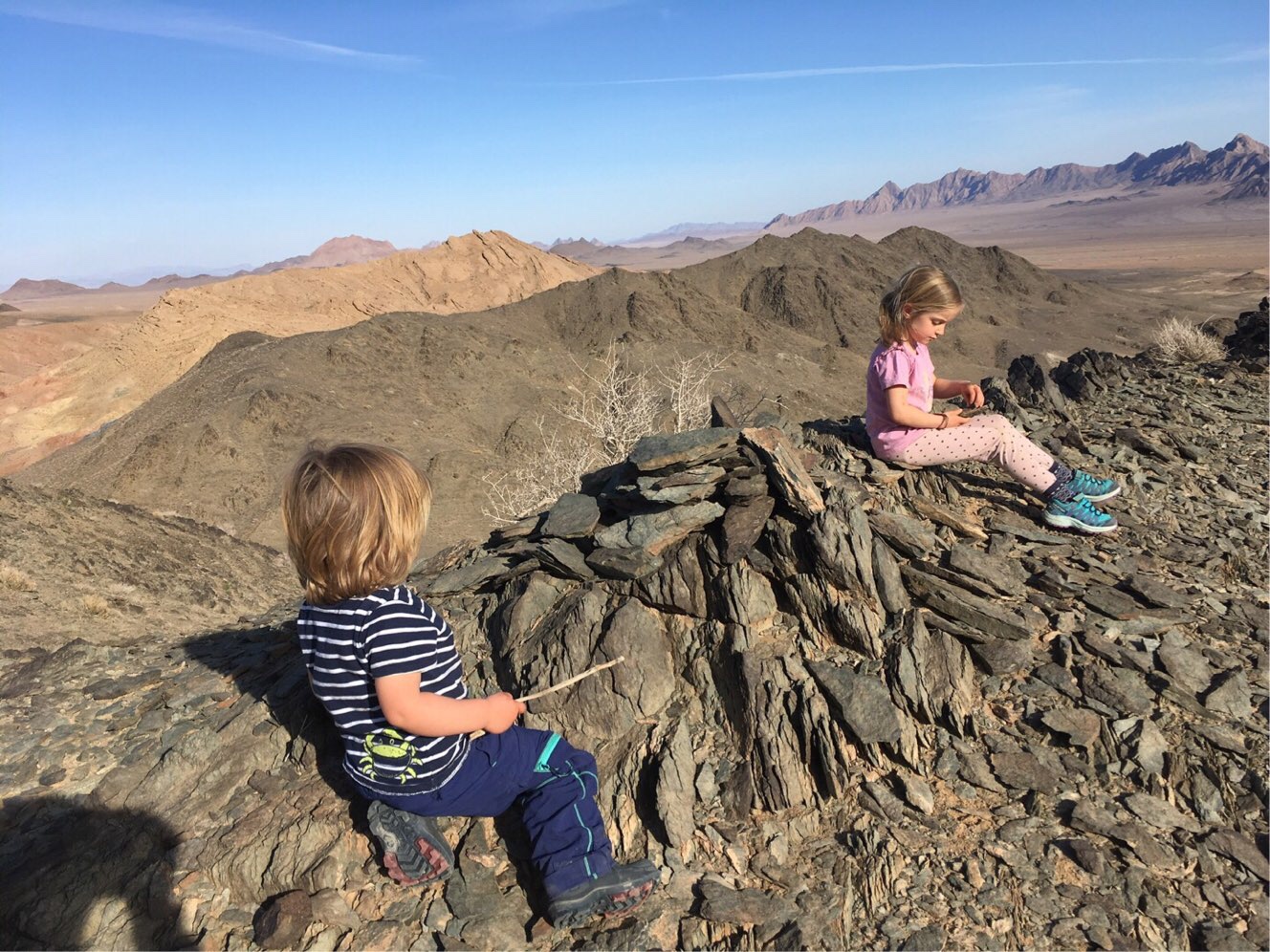 Am Nachmittag erreichten wir das hübsche Wüstendorf Anarak, von wo aus mehrere Pisten die Berge hinauf führten. Eine erste endete an einer Stein-Ruine – schon von hier hatten wir einen atemberaubenden Blick auf Wüste, Salzseen, Dorf und Berge. Und wir sahen eine zweite Piste noch höher in die Berge aufsteigen. Aber auch hier endeten wir irgendwann in steilen Fels-Gefilden. Die Kinder freuten sich und waren rasch die Felsen hochgekrakselt. Ich kletterte hinterher und wir tranken unsere Ankunfts-Fanta mit Blick auf die Berge in alle Richtungen. Nach dem Abendessen genossen Martin und ich Lagerfeuer und Kesh-Mesh mit Traum-Blick.
