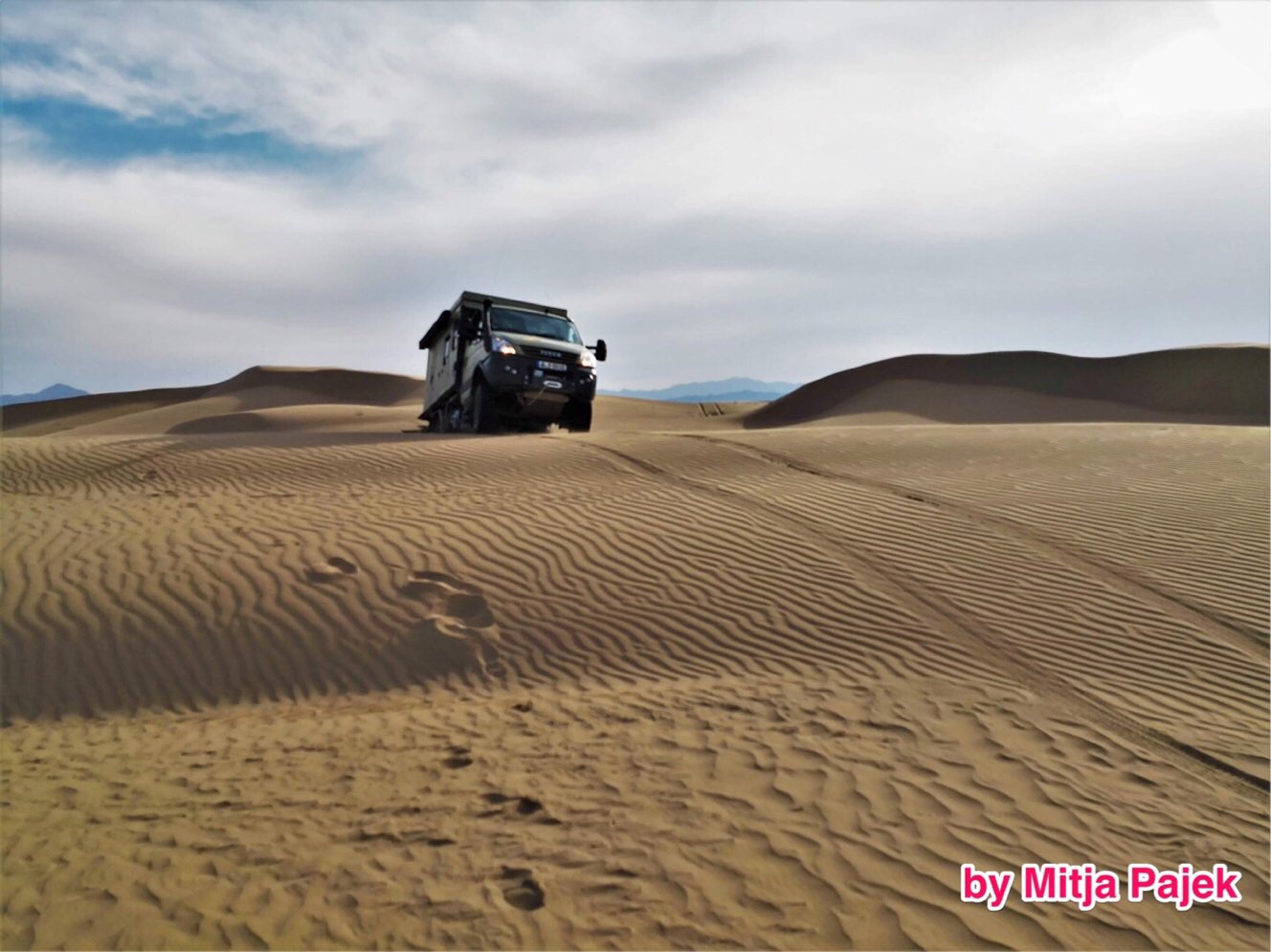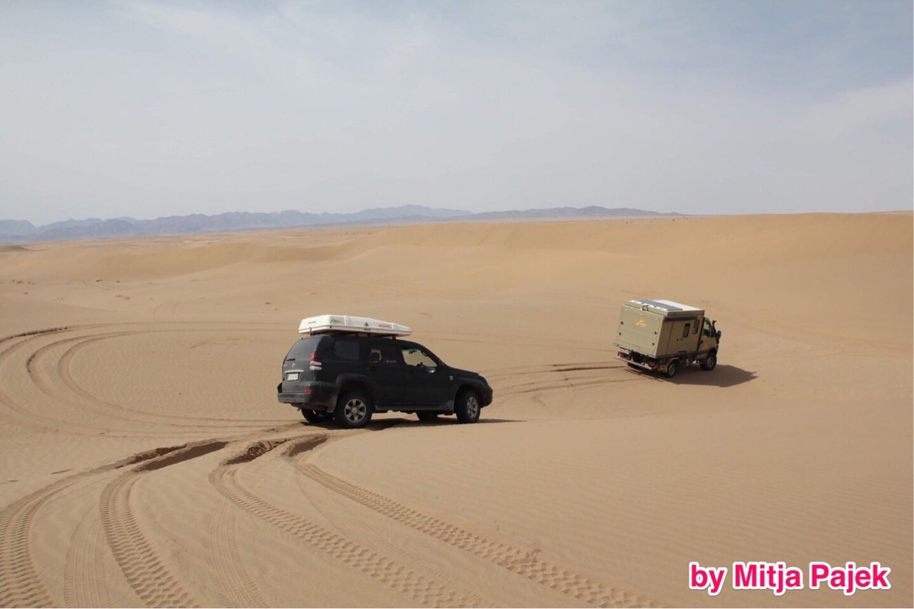 Mitja als erfahrener Dünen-Fahrer hatte mit seinem wenig beladenen Landcruiser das perfekte Fahrzeug und Gewicht – er nahm die Dünen spielend. Wir waren zum ersten Mal mit dem unvergleichlich schwereren Pluto in der Wüste. Zu Beginn blieben wir mehrmals im Sand stecken, konnten uns aber mit der Seilwinde am Landcruiser rausziehen. Schnell zeigte sich die Übung und Martin nahm mit dem Pluto Düne für Düne auf dem Weg zu unserem Plätzchen für die Nacht.