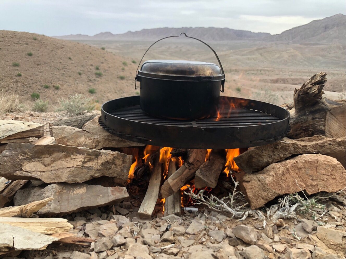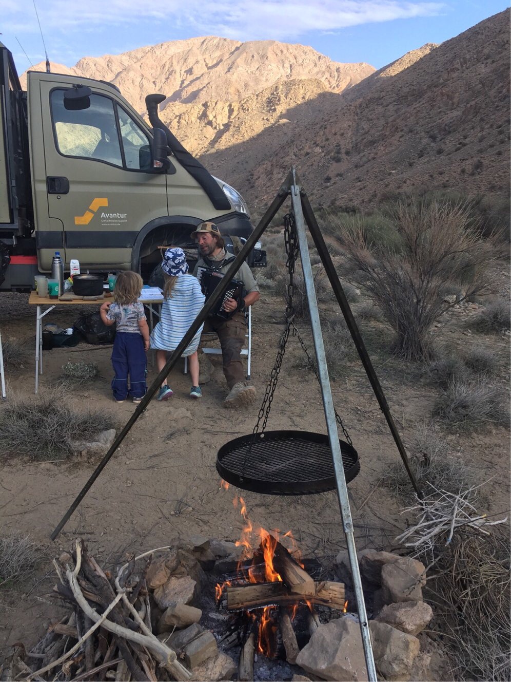 Bereits morgens hatten zwei nette Iraner den Weg zu unserem Plätzchen gefunden – und sich über Kaffee und Zigaretten von uns gefreut und Balthasar dafür mit Mengen an Nüssen ausgestattet. Am Nachmittag packte Martin sein Akkordeon aus, was ebenfalls als Hinweis auf große Entspannung zu werten ist. Und auf dem Feuer gekocht haben wir in diesen Tagen ebenfalls wie die Könige.