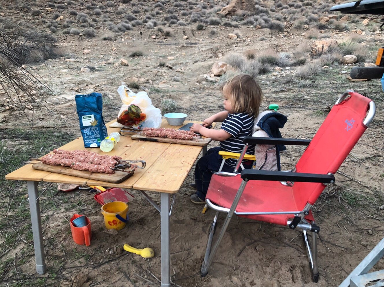 Bereits beim Pluto parken sah Martin unter einigen größeren Steinen die ersten Skorpione. Klein und gelblich-durchsichtig und damit eine der giftigeren der 1.500 Skorpion-Arten (Feld- oder Mittelmeerskorpion – ganz einfach ist die Bestimmung bei dieser Artenvielfalt für uns Laien nicht). Schon am ersten Abend durchtrennten wir mehrere von ihnen mit dem Spaten. Skorpione sind nachtaktiv und suchen tagsüber Schutz in ihren Höhlen oder unter Steinen. Von Beginn an mussten die Kinder also trotz der sommerlichen Temperaturen feste Schuhe tragen und durften keine Steine aufheben. Für Balthasar war das eine echte Einschränkung. Überraschenderweise hielt er sich aber recht gut an das Steine-Aufheb-Verbot – Verbote befolgen ist ansonsten zumindest aktuell nicht so seine Stärke. Josefine mit ihren fast sechs Jahren war vom ersten Anblick der Skorpione beeindruckt genug, um Vorsicht walten zu lassen.