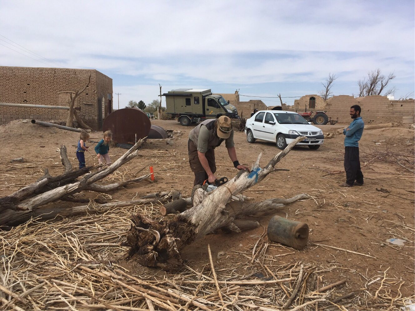 Die Mesr-Wüste ist eine der wenigen Regionen der Großen Kavir mit ausgedehnten, herrlichen Sanddünen. Auf dem Weg nach Mesr deckten wir uns mit Wasser und, wegen des Holz-Mangels, mit Grill-Kohlen ein. Verrückterweise fanden wir kurz vor Mesr sogar Holz – nach zwei Fahrtagen durch die karge Salzwüste konnten wir unser Glück kaum fassen! Im Wüsten-Oasen-Dorf Amirabad kurz vor Mesr lagen Unmengen Holz herum. Wir fragten den Bauern und durften gegen Geld Holz aufladen.