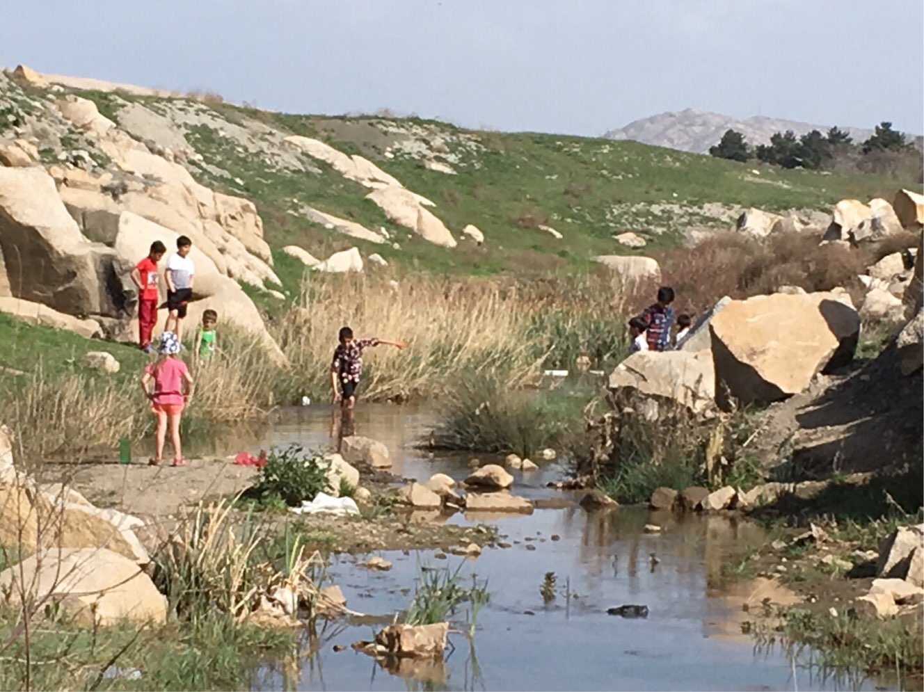 Leider war mit den neuen Filtern das Problem nicht gelöst. Bei der Iveco-Werkstatt konnten wir erreichen, dass gegen 16 Uhr jemand da sein würde. Es war mittlerweile richtig heiß geworden. Um die Zeit zu überbrücken, fuhren wir einen Flusslauf westlich von Maschhad bergauf. Dort fanden wir tatsächlich etwas Abkühlung und die Kinder liefen mit einigen iranischen Jungs barfuß den Flusslauf entlang ein paar Fröschen hinterher. Wie so oft war Josefine das einzige Mädchen bei solchen Kletter- und Erkundungstouren. Die iranischen Mädchen spielten in voller Montur in der Wiese.
