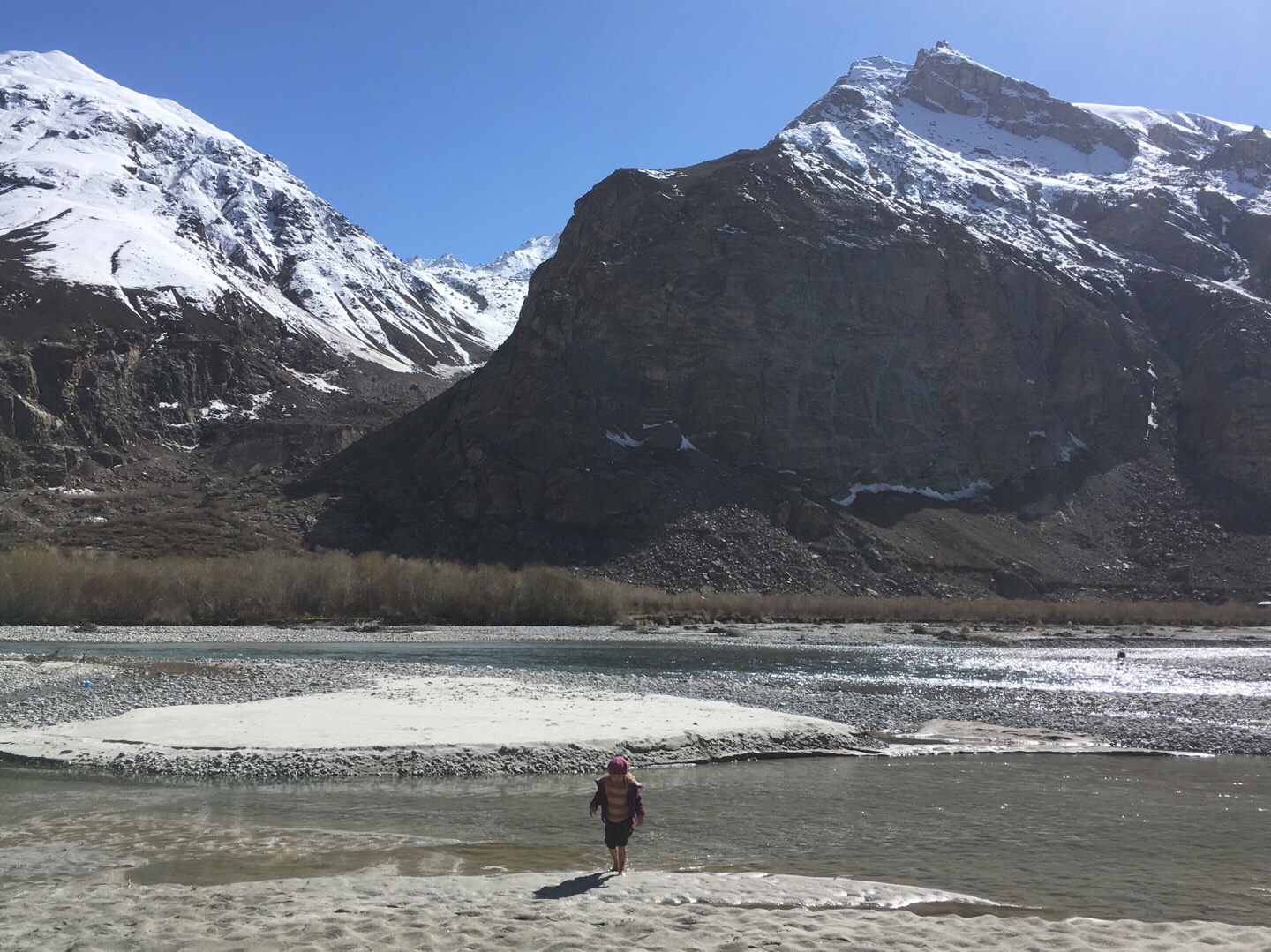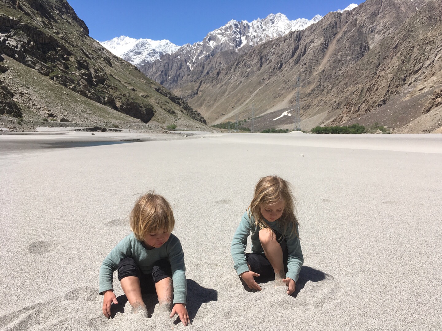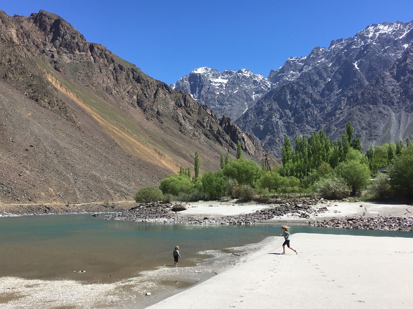 Am nächsten Morgen hielten wir, zurück am Pandsch, an einem Sandstrand, wo die Kinder wie wild durch Sand und Fluss tollten. Die langen Fahrtage brachten natürlich Bewegungsbedarf.