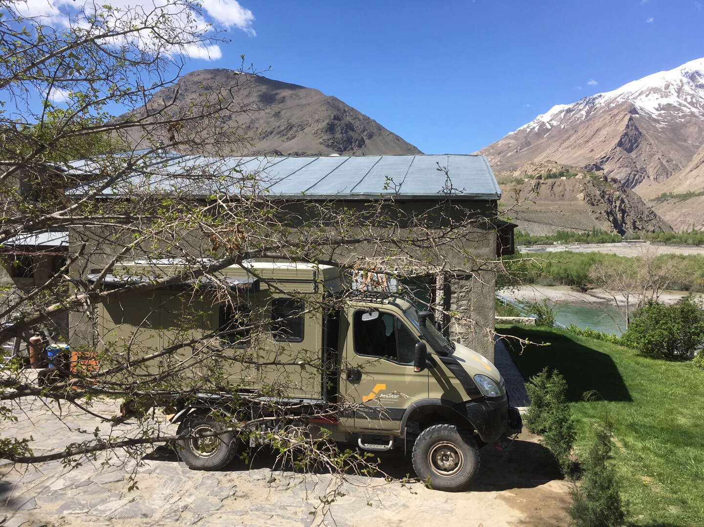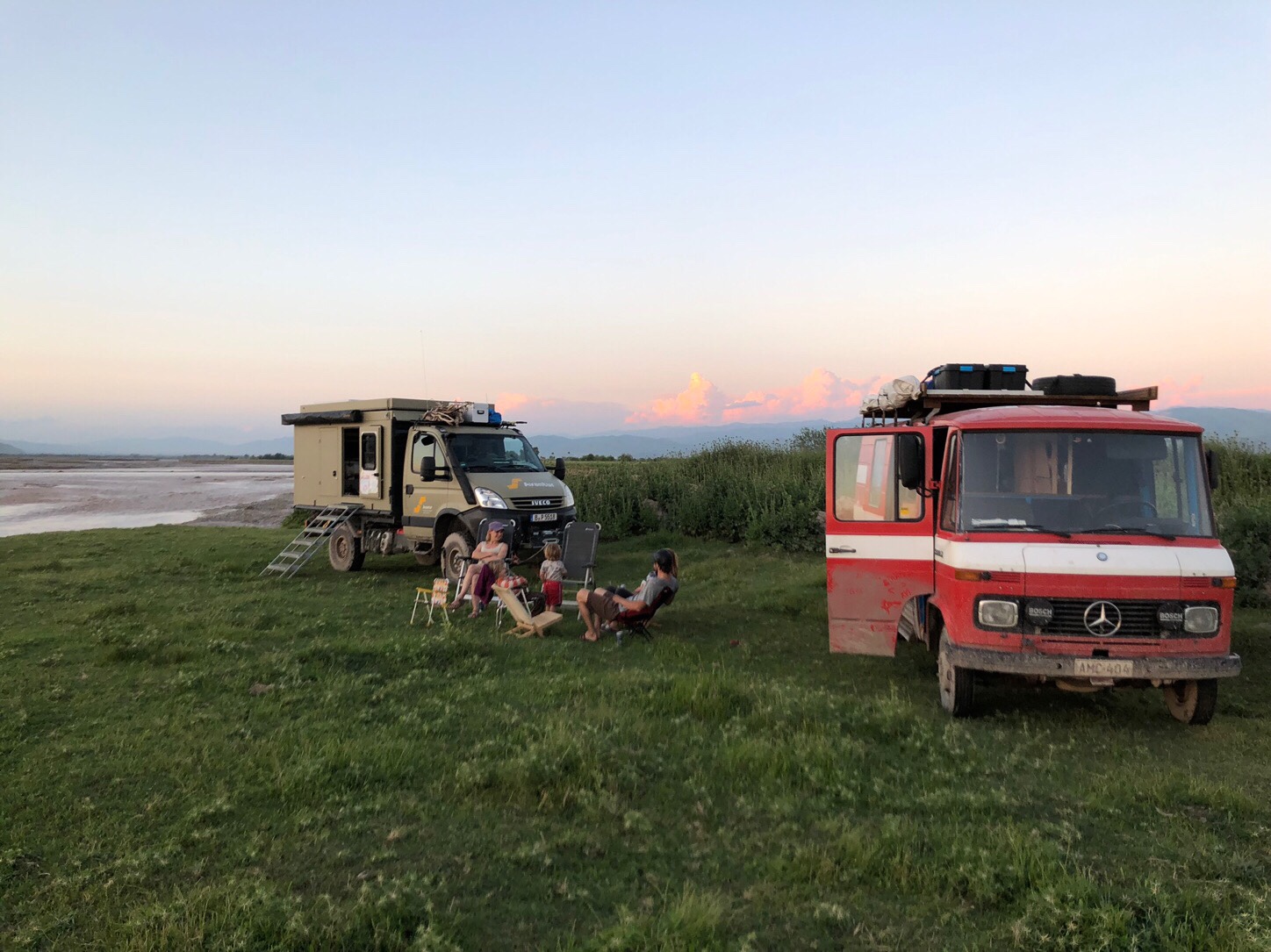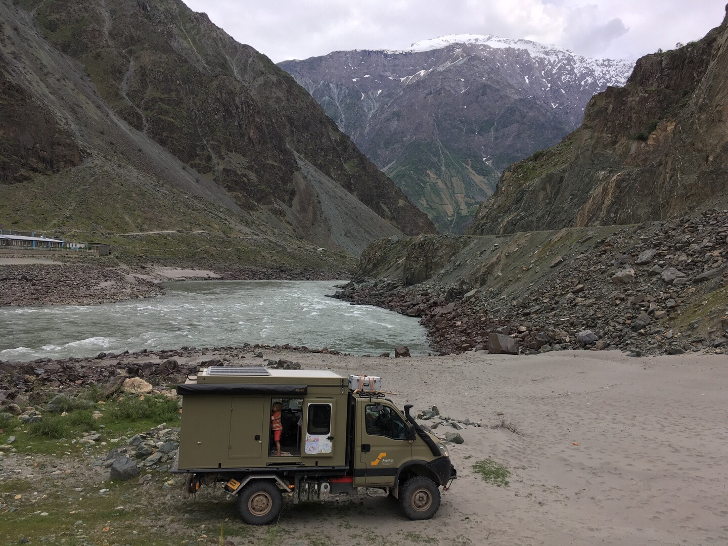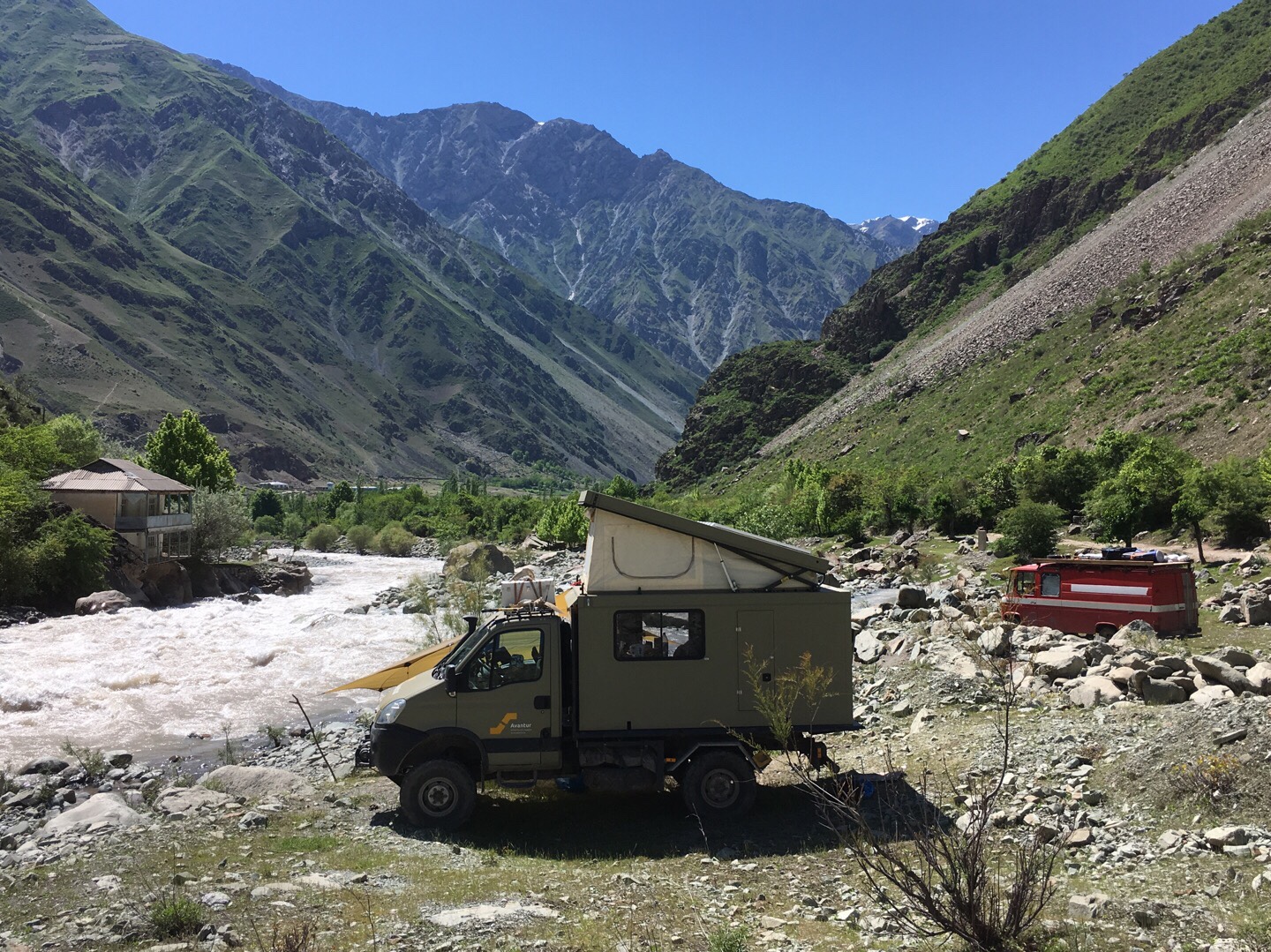 Als wir alle wieder trocken waren, fuhren wir weiter Richtung Kulob. Auf dem Weg dorthin lernten wir Sarah und Ville im roten Feuerwehr-Mercedes kennen, mit denen wir im weiteren Verlauf unserer Reise ein paar wunderbare Tage und Nächte verbringen sollten. Wir fanden ohne viel Suchen einen tollen Stellplatz für eine Nacht am Yakhsu-Fluss kurz vor Kulob. Die Nacht brachte deutlich zu viele Biere und Gin Tonics mit sich, aber die Gespräche und die gemeinsame Zeit mit Sarah und Ville waren total angenehm, obwohl wir die beiden gerade erst kennengelernt hatten.