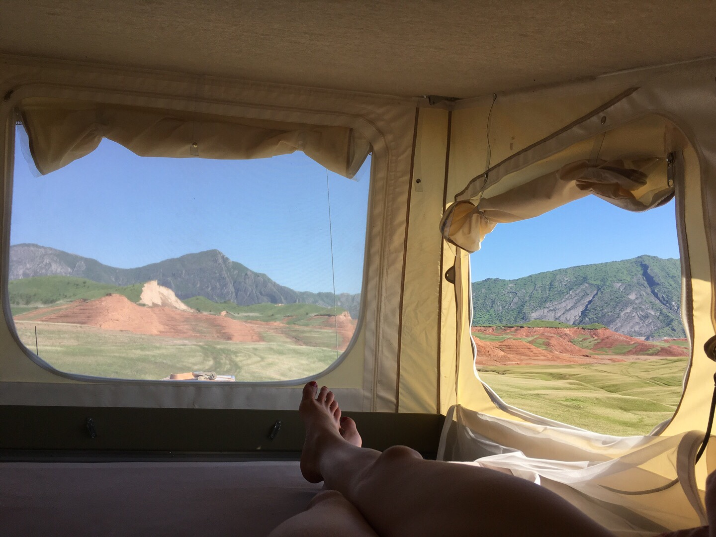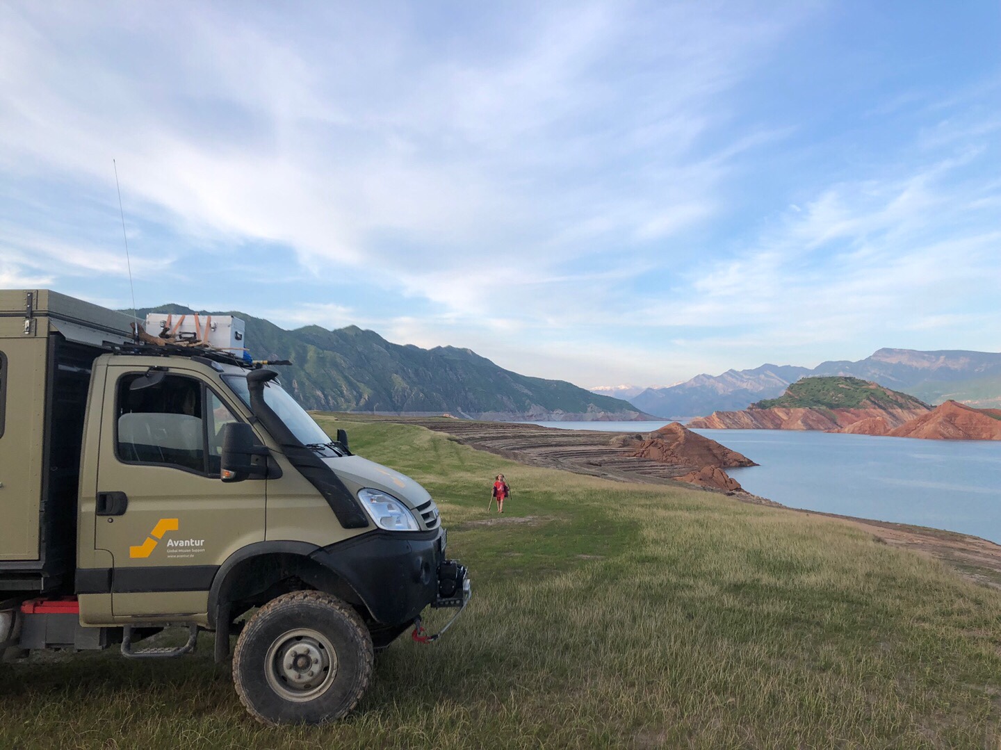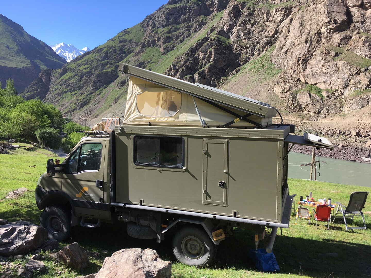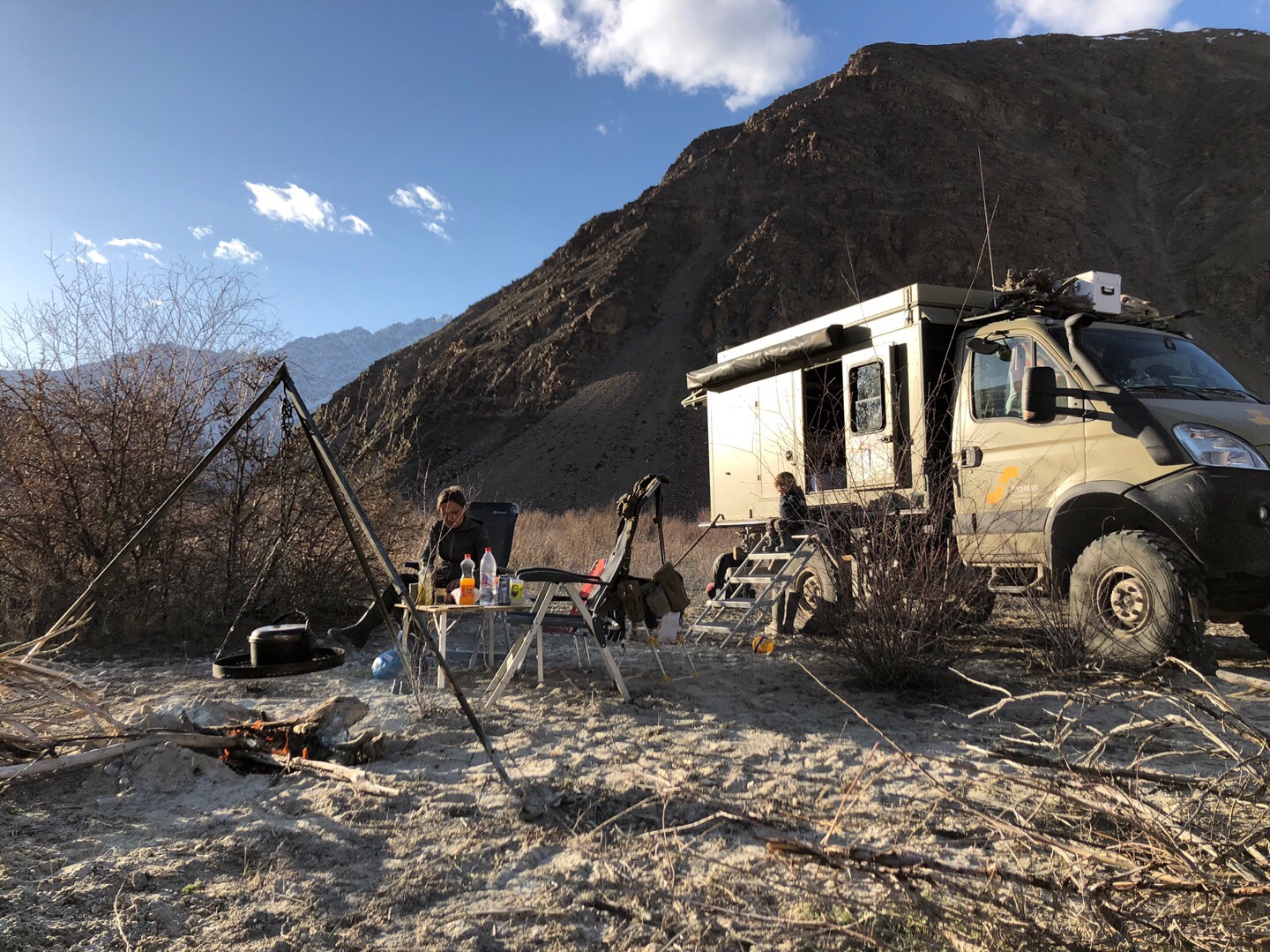 Als wir alle wieder trocken waren, fuhren wir weiter Richtung Kulob. Auf dem Weg dorthin lernten wir Sarah und Ville im roten Feuerwehr-Mercedes kennen, mit denen wir im weiteren Verlauf unserer Reise ein paar wunderbare Tage und Nächte verbringen sollten. Wir fanden ohne viel Suchen einen tollen Stellplatz für eine Nacht am Yakhsu-Fluss kurz vor Kulob. Die Nacht brachte deutlich zu viele Biere und Gin Tonics mit sich, aber die Gespräche und die gemeinsame Zeit mit Sarah und Ville waren total angenehm, obwohl wir die beiden gerade erst kennengelernt hatten.