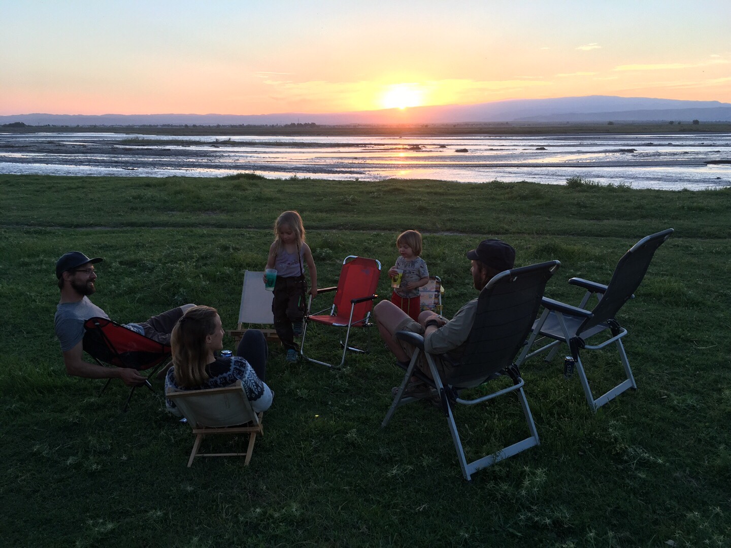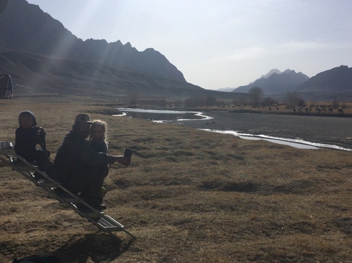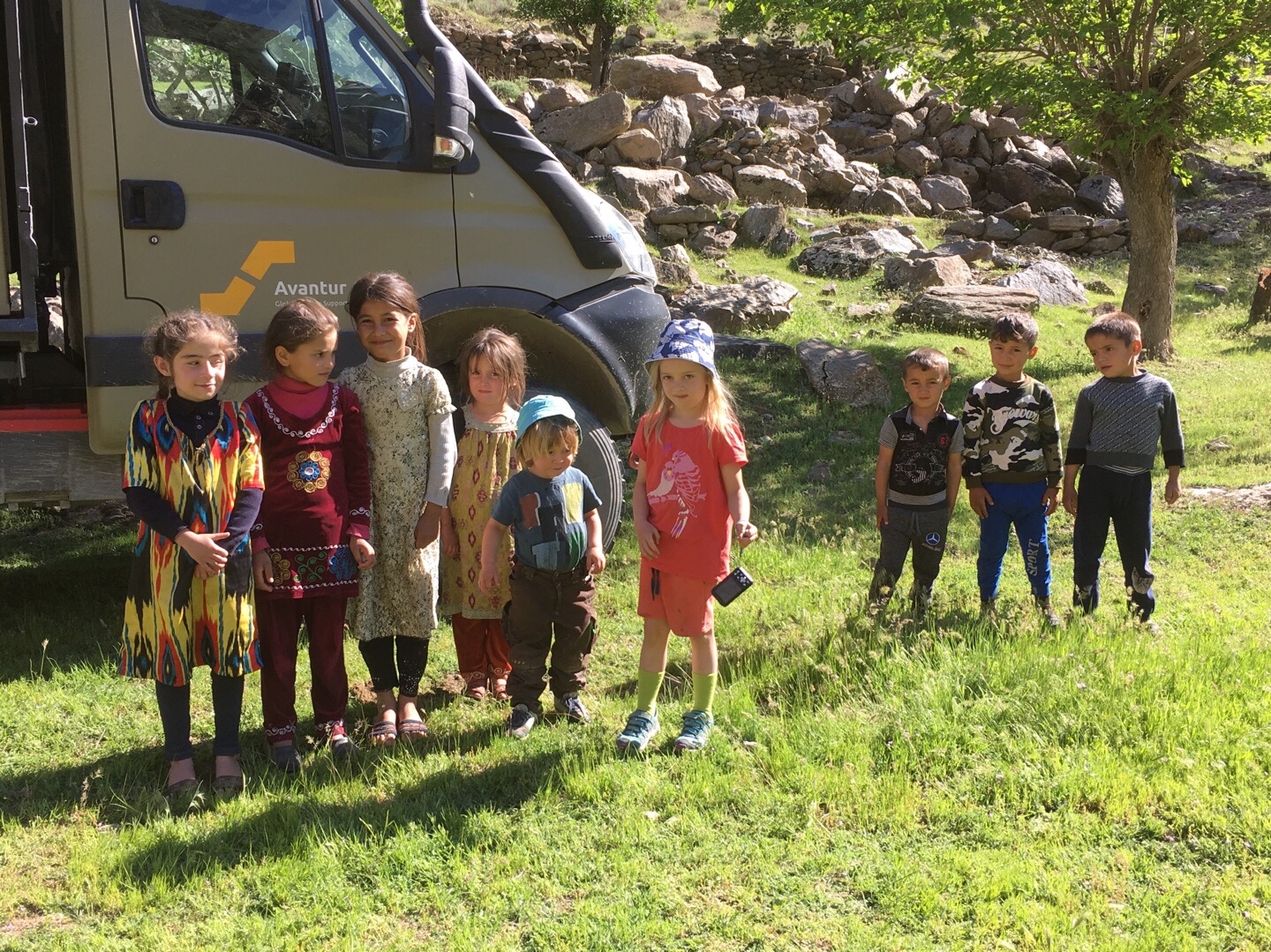 Auch Sarah und Ville kamen an den Strand. Polizisten bedeuteten uns, weiterzufahren. Um unser Nachtlager mit etwas Entfernung zur Grenze aufzuschlagen, folgten wir einem der nächsten Zuflüsse des Pandsch ein Stück bergan und fanden eine wunderbare Stelle. Während ich die Kinder ins Bett brachte, baute Martin mit Sarah und Ville unsere Zelt-Sauna auf, die wir zum letzten Mal in der Türkei genutzt hatten. Das zeigt, wie hilfreich es gerade mit kleinen Kindern ist, mit mehreren Erwachsenen unterwegs zu sein. Martin und ich alleine hätten die Sauna für eine Nacht nicht aufgebaut. Auch hatten Sarah und Ville tatsächlich noch gespaltenes Holz aus Deutschland im Feuerwehrauto. Die Sauna samt anschließendem Bad im Fluss waren ein Genuss! Am nächsten Morgen kam eine ganze Horde Kinder aus dem Dorf vorbei, die sich neugierig in unseren Schatten gesellten. Andere Dorfbewohner kamen von ihren Feldern und schenkten uns frischen Rhabarber. Unglaublich, diese Herzenswärme gegenüber Fremden!