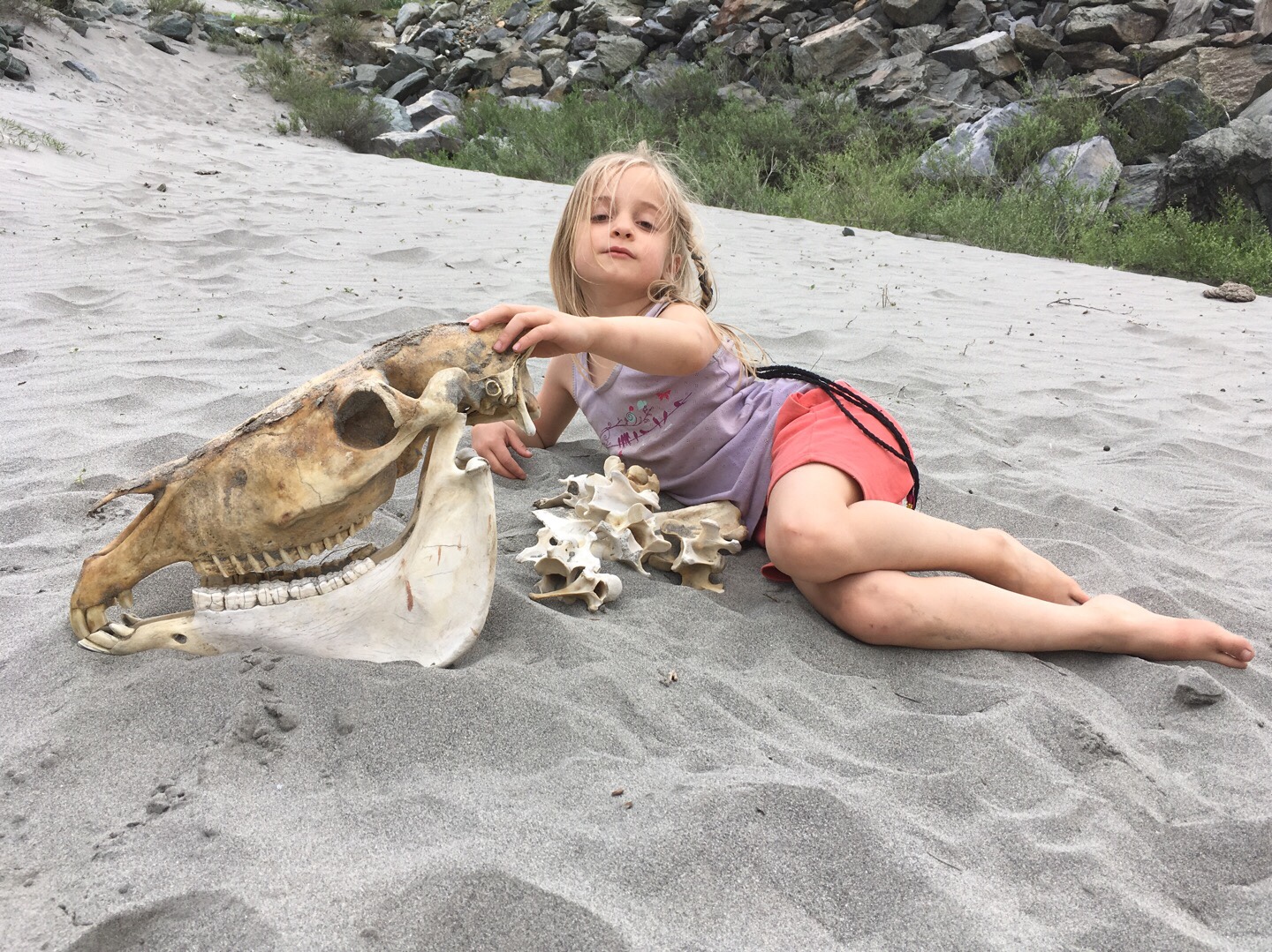 Nach einem weiteren Polizei-Checkpoint bogen wir an eine der Sandbuchten am Pandsch ein für eine Pause und eventuell eine Nacht. Die Kinder genossen das Buddeln im Sand und Josi fand ein vollständiges Skelett eines Pferdekopfs, das uns seitdem auf dem Dachträger begleitet.