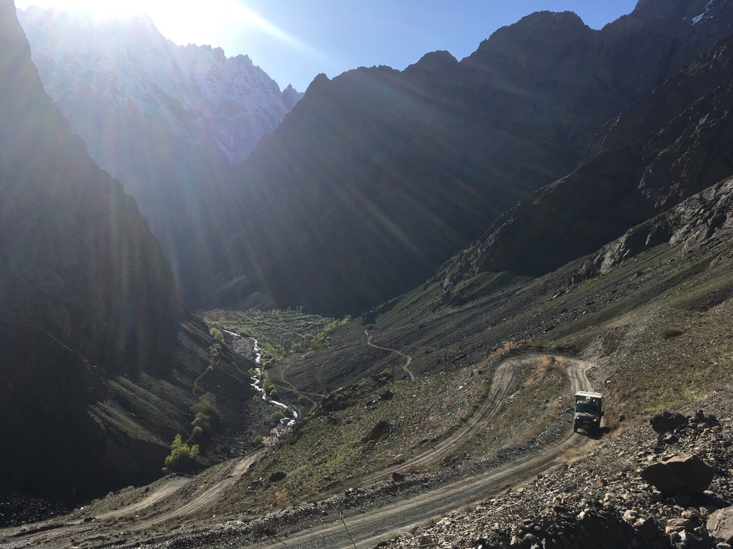 Nach dem nächsten langen Fahrtag wollten wir wieder an einem Zufluss des Pandsch ein Stück in die Berge fahren. Wir fanden nicht sofort einen Platz und sahen enorme Serpentinen bergaufwärts Richtung Abendsonne und Schneeberge steigen. Der Weg führte uns in einer knappen Stunde von 2.000 Höhenmetern am Pandsch auf ein Hochplateau auf 2.850 Metern. Wir fanden ein einfaches Nachtlager auf einer Wiese am Weg, dafür mit herrlichem Blick in alle Richtungen. Wieder besuchenten uns einige neugierige einheimische Kinder.