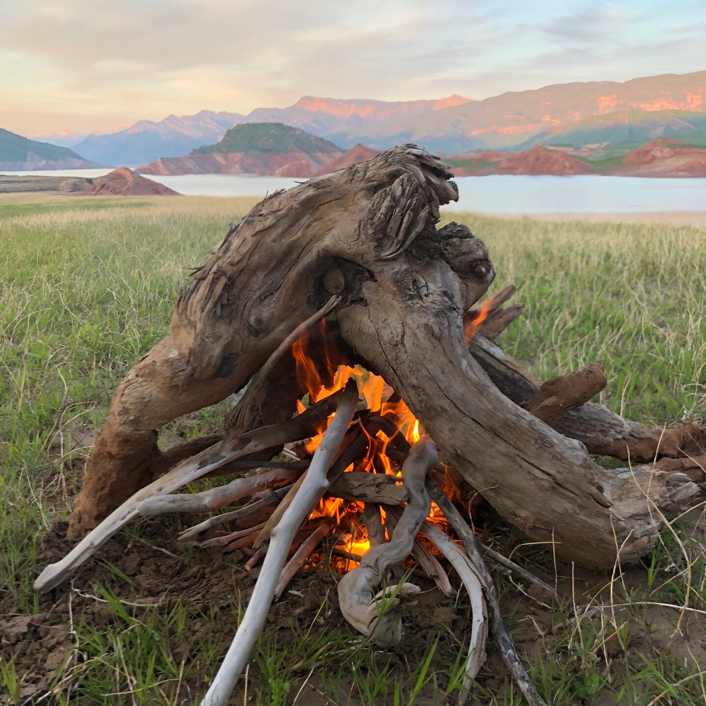 Nachdem es nun länger nicht geregnet hatte, probierten wir noch einmal die Abzweigung zum See, bei der wir beim ersten Mal im Matsch umgedreht hatten. Bei trockenem Untergrund war die Strecke zwar anspruchsvoll, aber problemlos machbar. Kurz vor unserem Nachtplatz oberhalb des Sees sanken wir noch mit einem Hinterrad im Matsch ein – mit etwas Luft ablassen und buddeln hatte Martin das schnell erledigt. Ein abendliches Lagerfeuer und eine Sternennacht rundeten den ersten Abend auf dem Pamir ab.