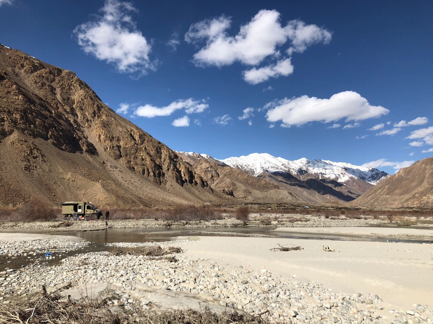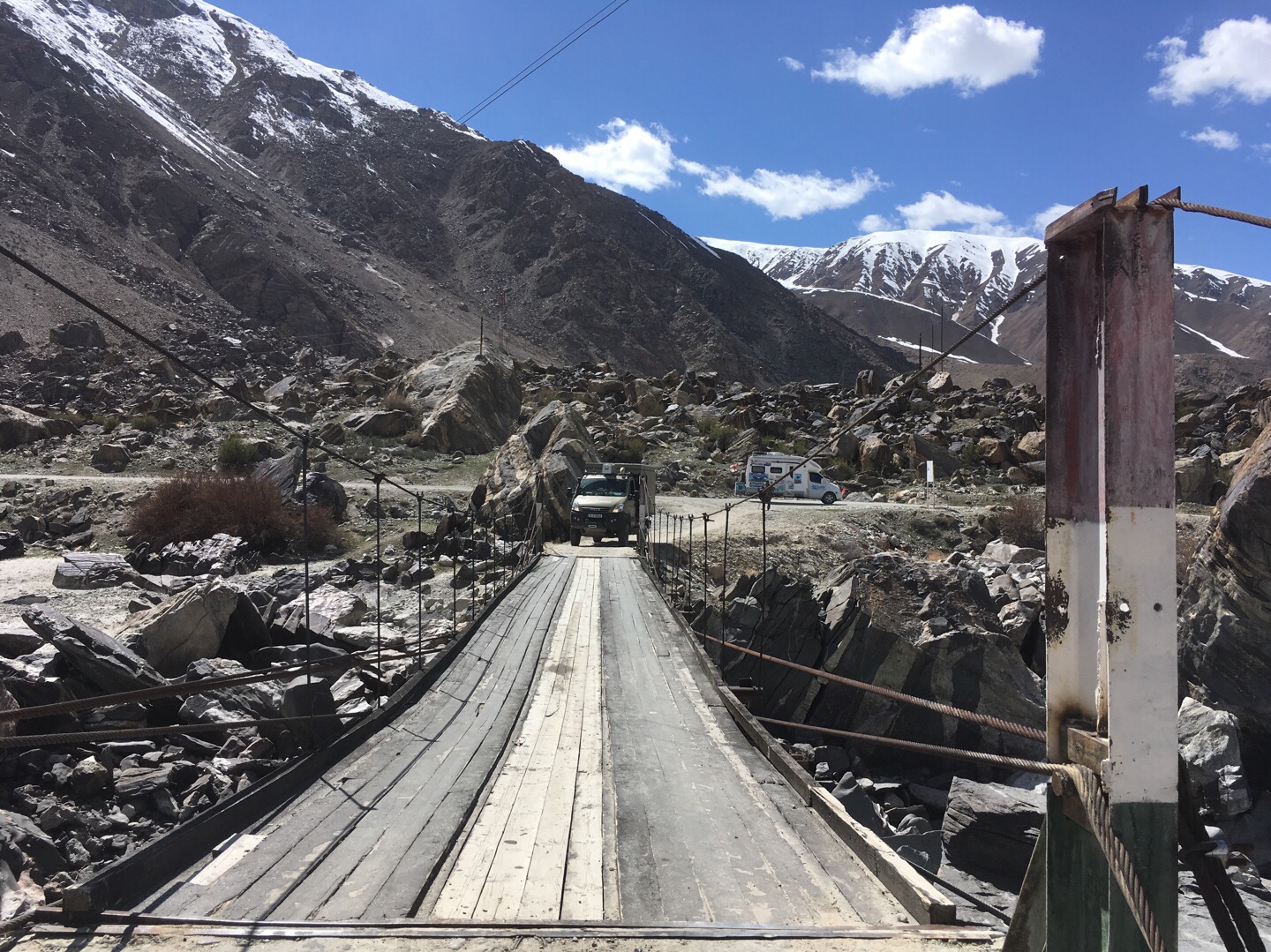 Wir verließen damit die afghanische Grenze und das fruchtbare Flusstal des Pandsch und fuhren in die hohen Berge des Pamir hinein. Die Landschaft war karg und eindrucksvoll. Gleich in der ersten Nacht fanden wir einen richtig schönen Stellplatz mit Lagerfeuer-Holz direkt am Fluss auf einer kleinen Insel. Dafür mussten wir über eine kleine Brücke fahren, durch die wir mit unseren 2,20 Metern Breite gerade so passten.