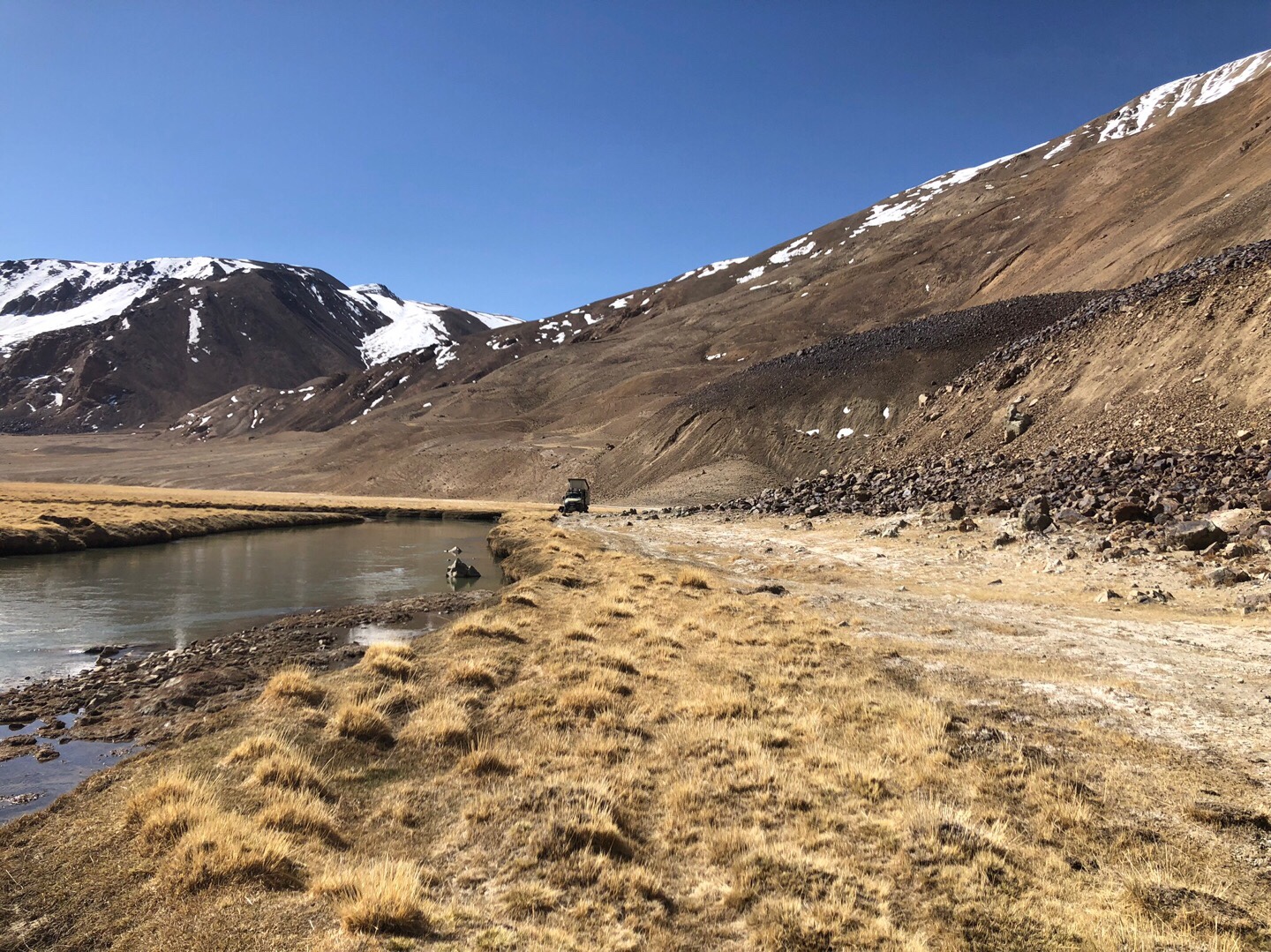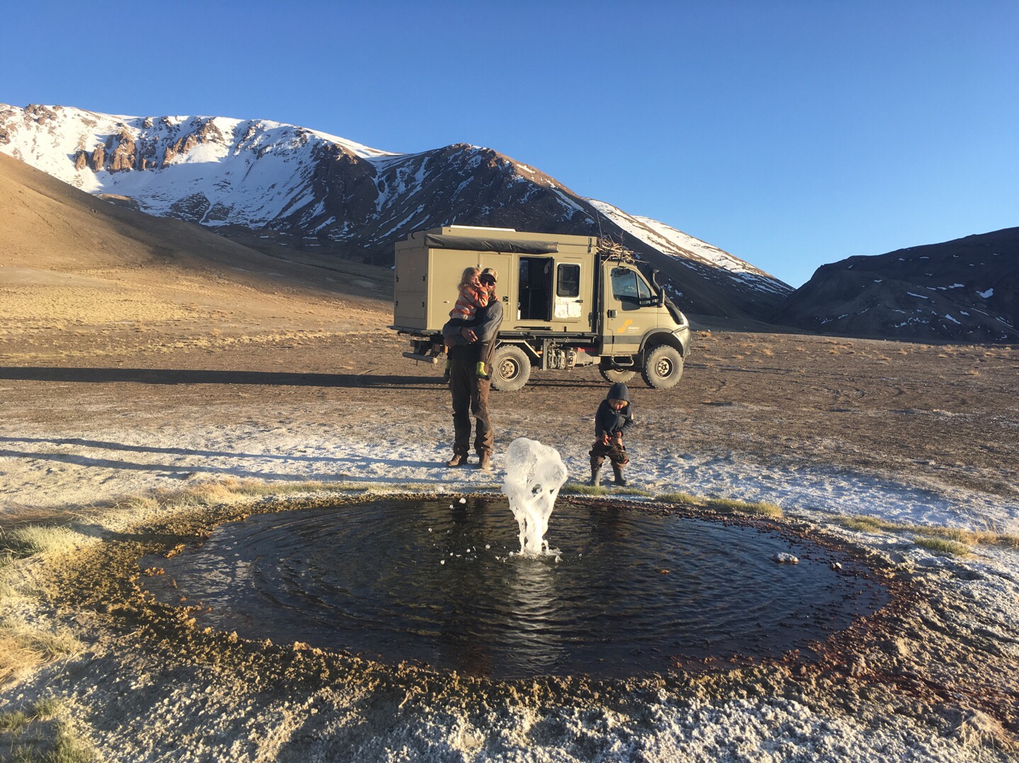 Der Boden war an vielen Stellen sumpfig, was die größte Herausforderung der Strecke ist. Unser Nachtlager schlugen wir direkt am Fluss auf – auf 3.770 Metern Höhe. Josefines Kopfschmerzen waren leider nicht besser geworden. Und dann fiel bei eisigen Nacht-Temperaturen unsere Standheizung aus. Wir kuschelten uns in den Schlafsäcken unter zusätzliche Decken und schliefen warm ein.