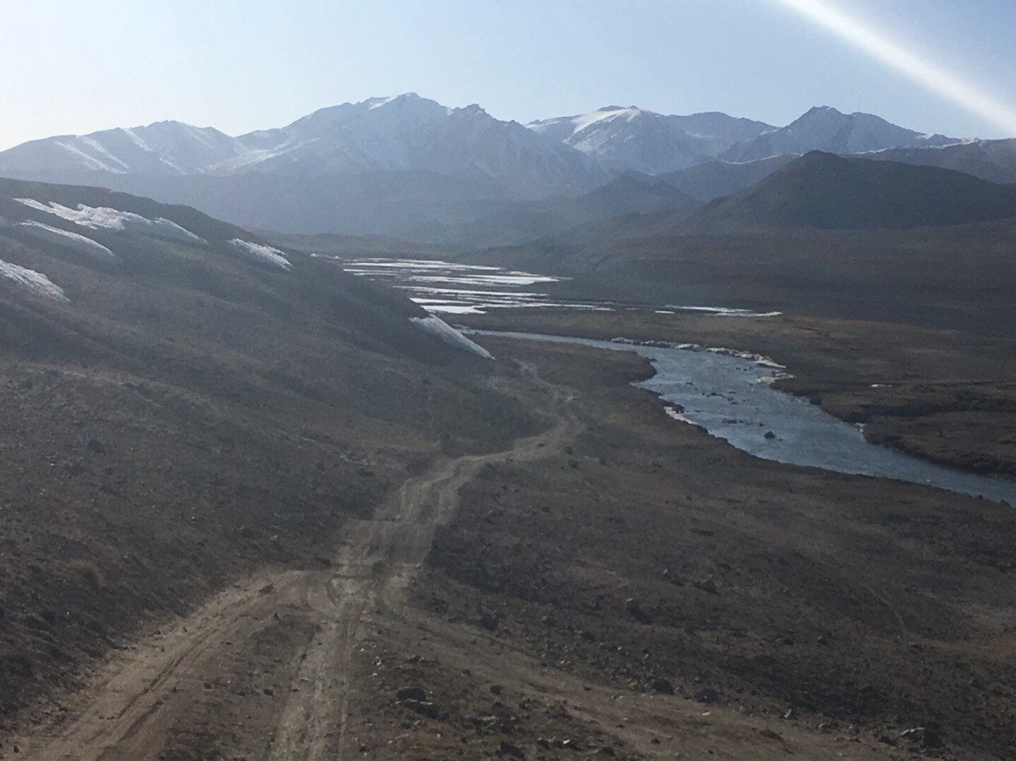 Am 1. Mai starteten wir den Pamir Highway von Duschanbe Richtung Osch in Kirgisistan. Der Pamir gilt als zweithöchste Hochgebirgsstraße der Welt – der höchste Pass geht über 4.655 Meter. Die etwa 1.200 Kilometer lange Strecke führt hunderte Kilometer entlang des Grenzflusses Pandsch zu Afghanistan. Die Straßenqualität auf dem Pamir Highway ist größtenteils schlecht mit unzähligen Schlaglöchern. Dennoch ist er einen Großteil des Jahres über befahrbar, auch weil er eine wichtige Transitstrecke für Laster aus China nach Tadschikistan und weiter in den Westen darstellt.